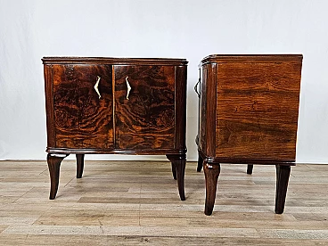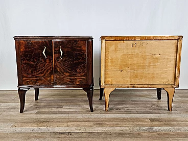 Modernised bedside tables from the 1950s with Art Deco inspiration, Italian production of high quality and workmanship. Note the distinctive wavy, machined legs and brass handles. Ample space inside the doors. The bedside tables have been polished with oil and shellac and show normal signs of wear and tear due to age and use.