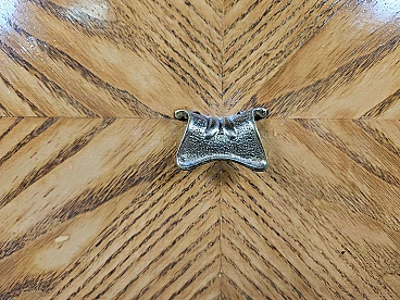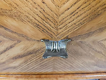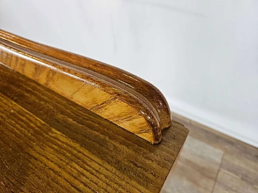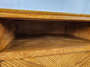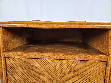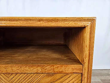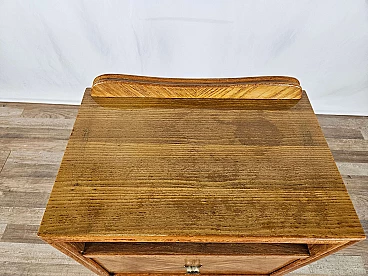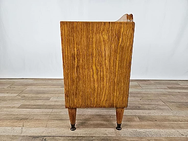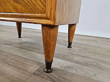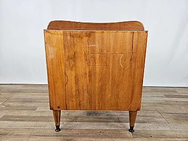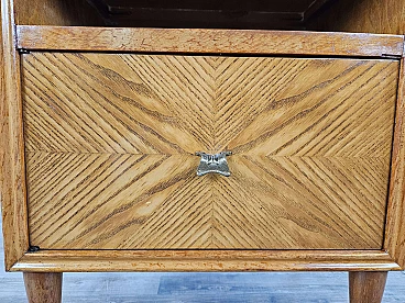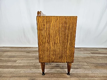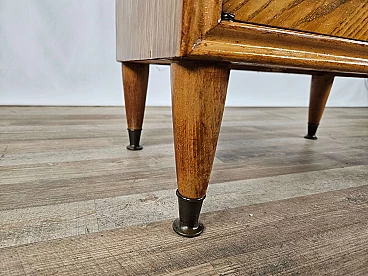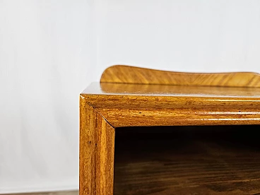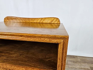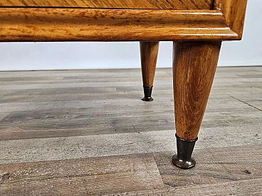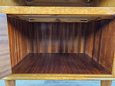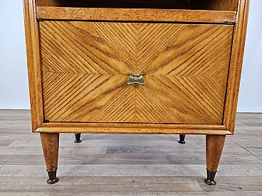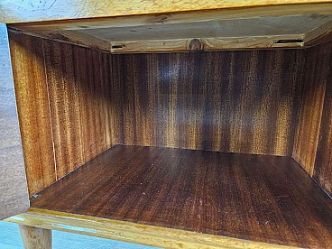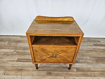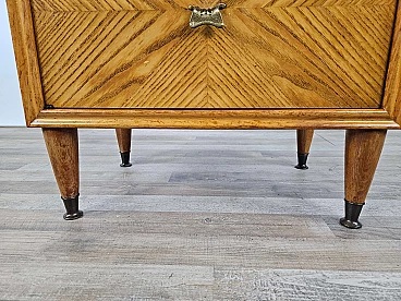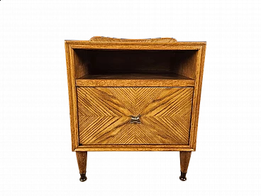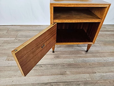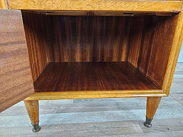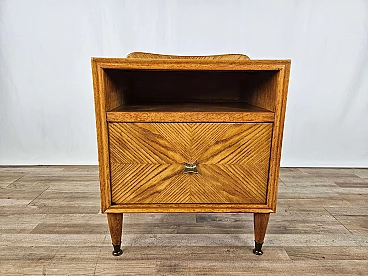 Single bedside table from the early 1950s in blond walnut with brass foot caps and central flap. Modern and contemporary design element, with square and linear dimensions that make it suitable for any furnishing context. Flap and upper open space.