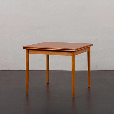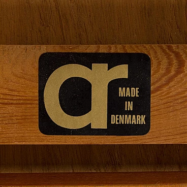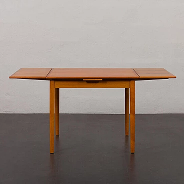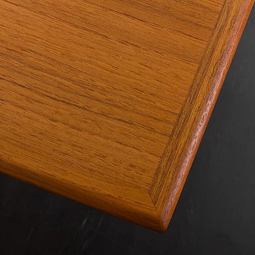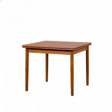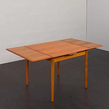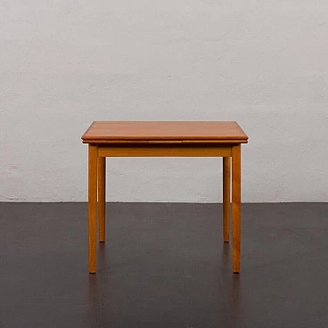 Classic mid-century square extending teak dining table with hidden leaves from the 1960s. Perfect for small dining rooms or for the kitchen as a breakfast table. It is manufactured by AR, one of Denmark's lesser-known mid-century companies, with very little furniture on the market. The manufacturer's label is preserved, confirming its age and provenance. It is very teak, with well-matched grain on the side extensions. The width varies from 87 cm to 156 cm. Perfect for 4-6 persons. The top has been renovated and is in excellent condition, with hardly any signs of use. Several layers of oil have been applied, giving it a natural, low-gloss appearance. The side doors slide smoothly. Additional dimensions: extensions: W: 34.5 cm / D: 87 cm; dimensions with side shelves: H: 72 cm / W: 156 cm / D: 87 cm; height at apron: 64.5 cm.