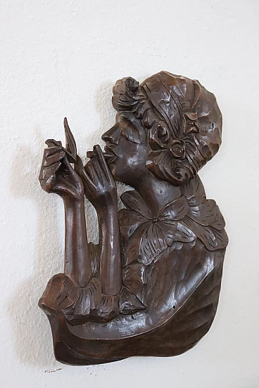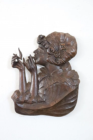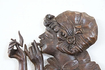 Art Nouveau walnut woman with cigarette bas-relief, early 20th century 6