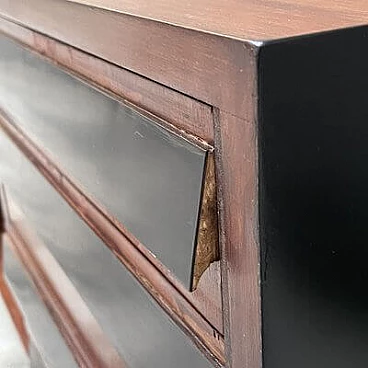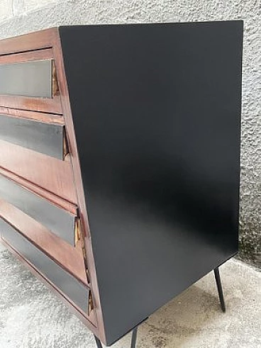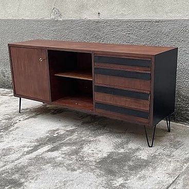 Wood, metal and laminate sideboard, 1950s. This piece of furniture combines mid-20th century Italian style with a splendid and practical, simple and functional design. The large space and easy-access drawers make it beautiful and practical. The painted metal feet give it character and personality, making it unique and making it stand out from all the other furniture of those years. The drawer fronts are characterized by black laminate, while the sides, also black, are lacquered. The surface has been polished.