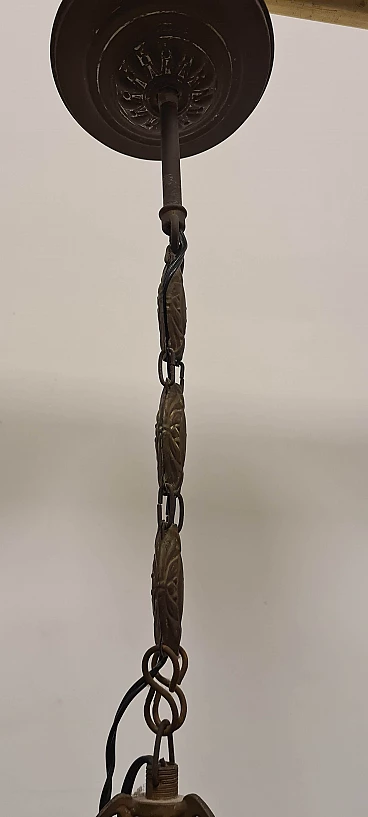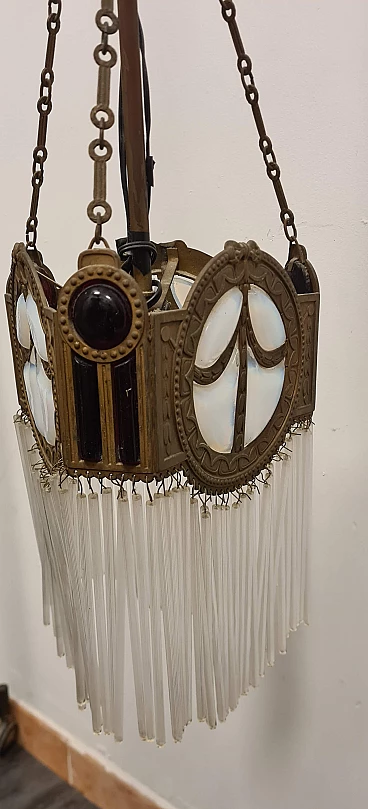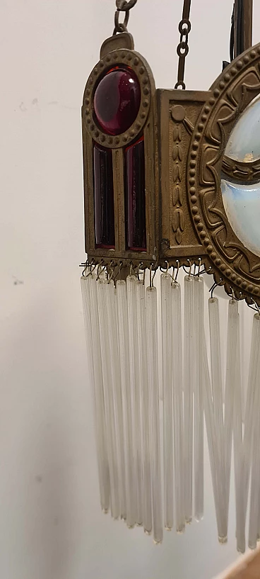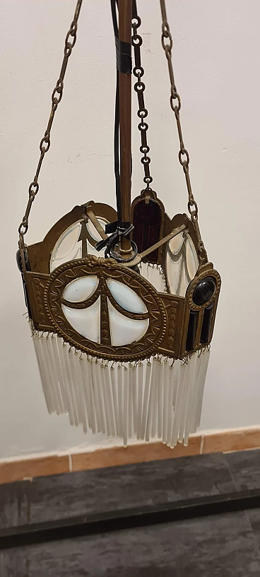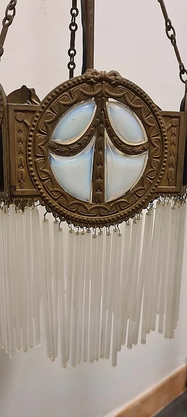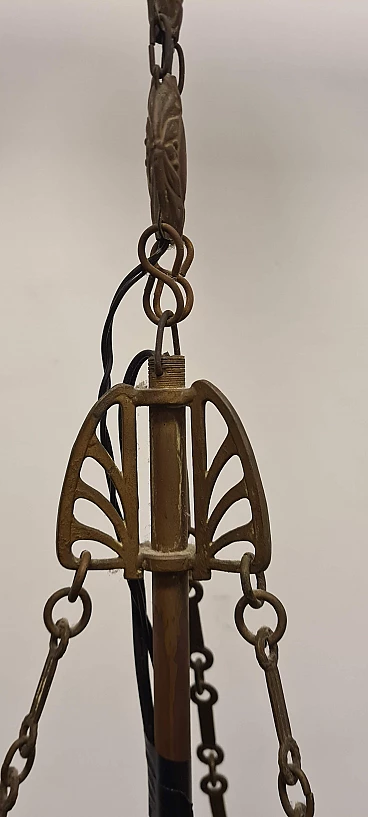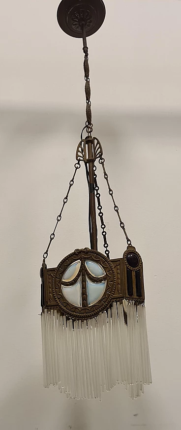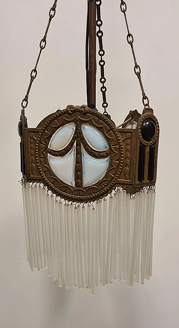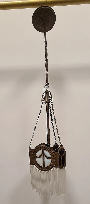 Refined Art Deco chandelier in a triangular shape with a gilded bronze frame, lacquered and red glass plates with hanging glass rods. The chandelier presents the typical style of the Art Deco period, featuring geometric motifs that help place it in the period. Art Deco was a phenomenon of taste that substantially affected the period between 1919 and 1930 in Europe, while in America, particularly the United States, it lasted until 1940. Perfectly functional, it has no structural defects, it does, however, have two faults visible in the photos, which are the absence of a glass rod and the absence of a piece of bronze decoration. The two shortcomings do not detract from its overall beauty and value.