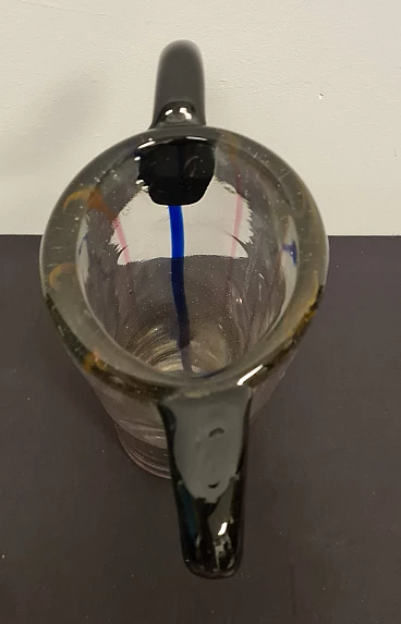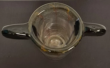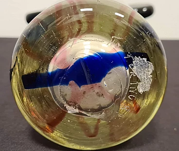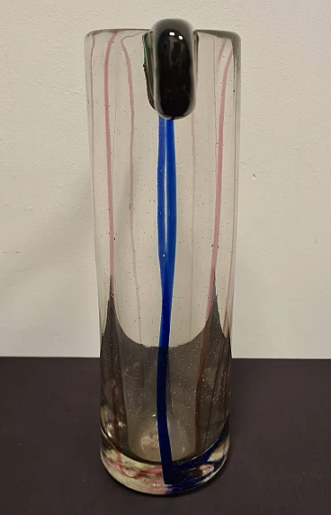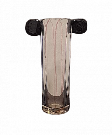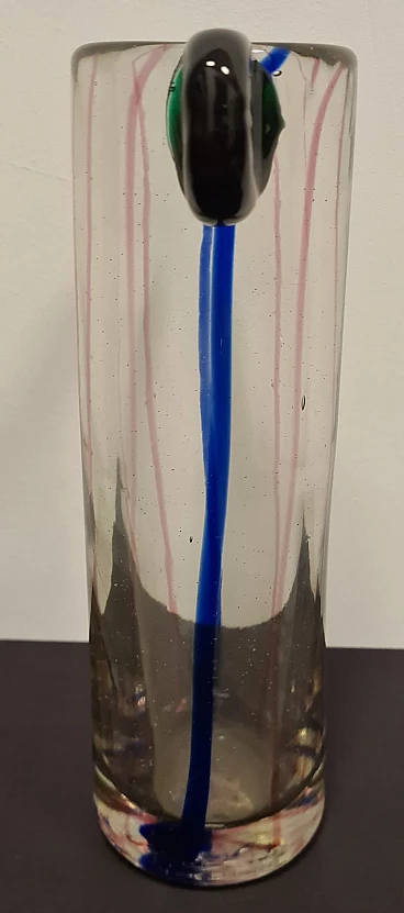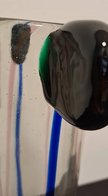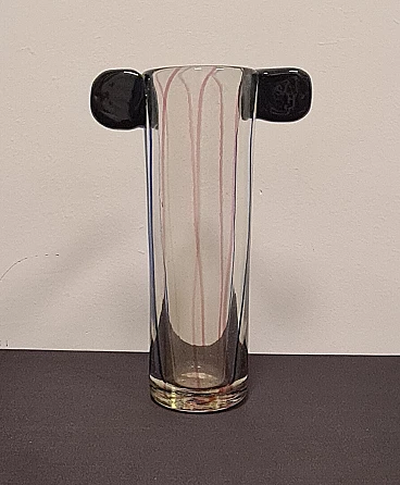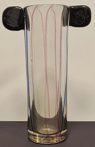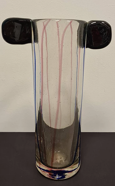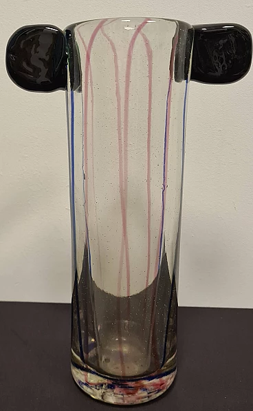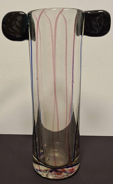 The central body of the vase is transparent with blue and pink inclusions, the two upper ears are made of hot-glued green glass.