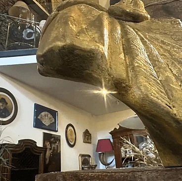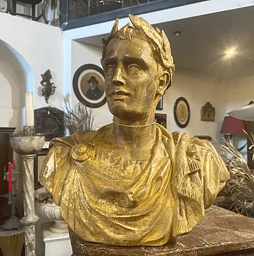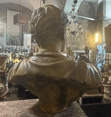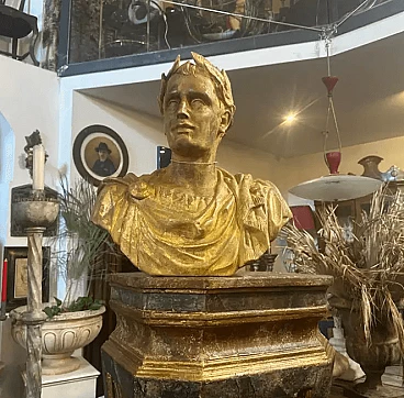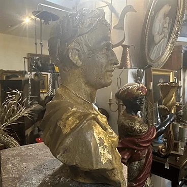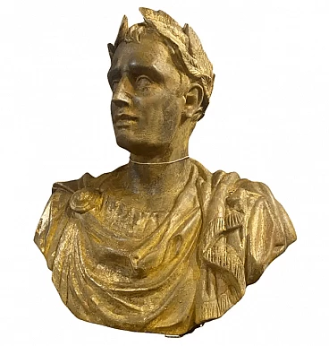 A gold-patinated plaster bust of Giulio Cesar from a plaster cast gallery of a Sicilian fine arts academy. Plasters were patinated in different ways, this was done with gold, amber and brown for a surprising result also given the time, they were probably used for theater sets. Plaster was a common material for sculpture, known for its versatility and ability to capture the finest details; the use of gold patina involves applying a thin layer of gold-colored finish to the surface of the sculpture.