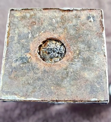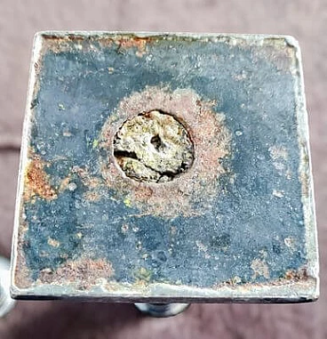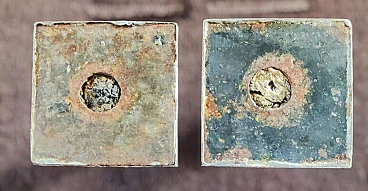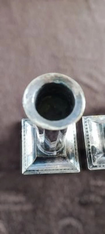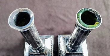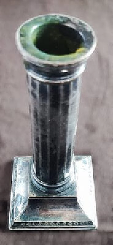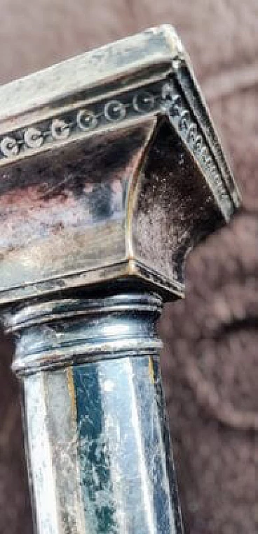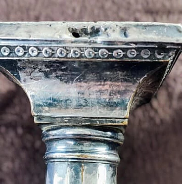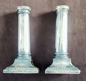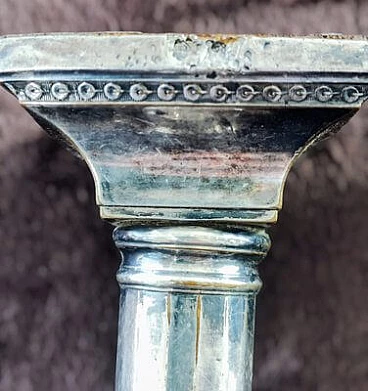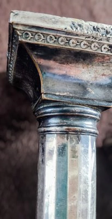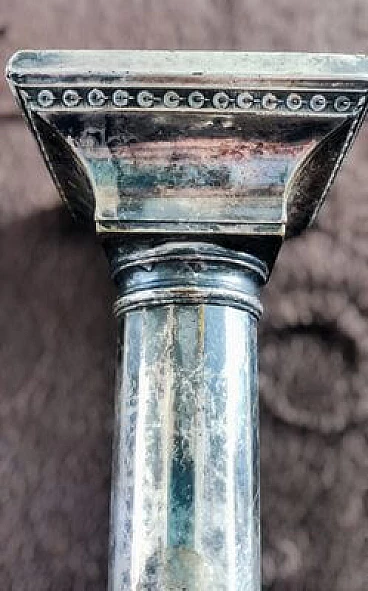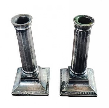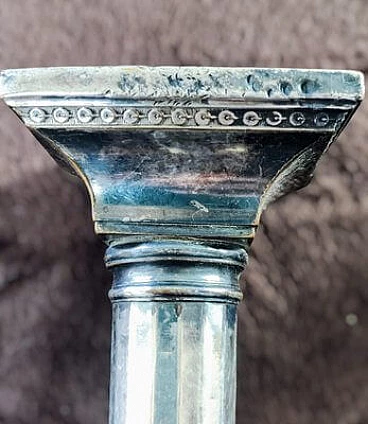 Pair of silver-plated single flame candelabra, Empire style (1802-1812) with original patina. In the form of a Doric column with a circle motif around the base.