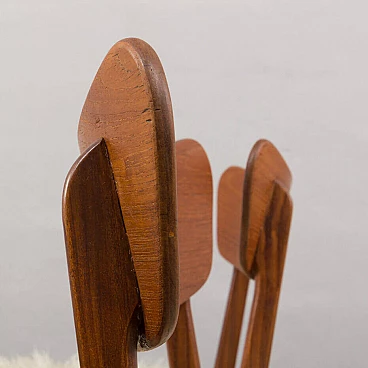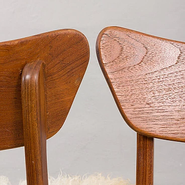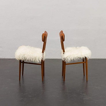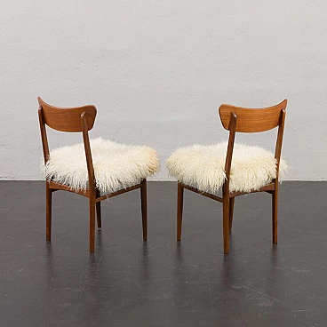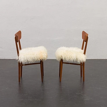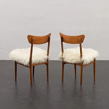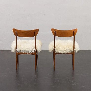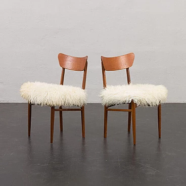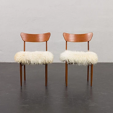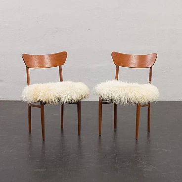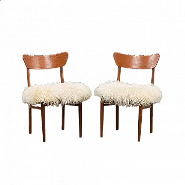 An extraordinary pair of Danish chairs that closely resembles Hans Wegner's designs from the 1960s. They feature a solid teak frame with a beautiful teak grain on the backrest. They are characterised by an organic shape and distinctive joinery typical of mid-century Danish design. The chairs have been upholstered in soft, all-natural long-haired sheepskin. Sheepskin has great anti-allergic properties and provides an electrostatic balance, which is very important in contemporary interiors full of artificial materials. These vintage chairs are an excellent example of simple and useful mid-century Danish design. The chairs can also be sold separately. The price of one of them is 60% of the set price. Our team has thoroughly checked the chairs. We made sure they are stable and sturdy. The wood has been cleaned and repainted with Danish oil.