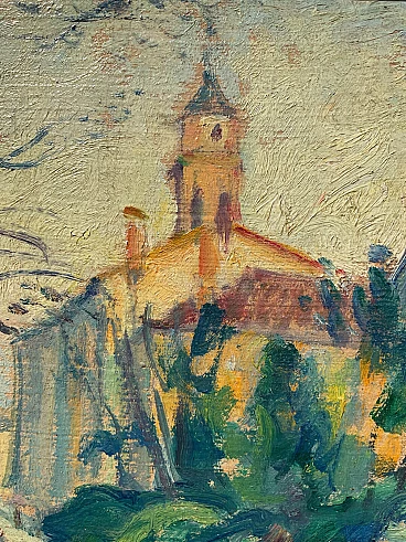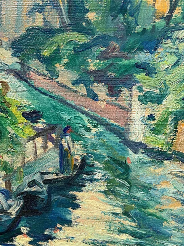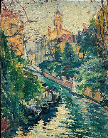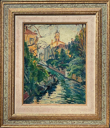 Oil painting on panel from the 20th century by Luigi Scarpa Croce (Venice, 1901 – 1967) depicting a view of Venice with the church of San Isepo a Castello. Signed lower right "L. Scarpa Croce". On the back, stamp of the Luigi Scarpa Croce Retrospective / 15-28 April 1967 – Opera Bevilacqua La Masa. The painting, in excellent condition, depicts a typical view of Venice with a canal and a church in the background. It is characterized not only by the pleasant subject, but also by the vivid light that is reflected in the colored touches of the canal water, in the play of chiaroscuro of the green of the trees and in the light and warm tones of the buildings and the sky. Graduated from the Academy of Fine Arts in 1923 after studying under the guidance of Ettore Tito, Scarpa Croce participated at a very young age in the exhibitions of Ca' Pesaro and at the Venice International Art Biennale where he also exhibited in 1928, 1932, 1934 ( invited), 1935 (invited), 1940, 1942, 1948, 1950. In 1930 he was called as artistic consultant to the first Quadrennial in Rome. His activity in the glass sector was also extensive, in which he worked, as a designer and as a technician, from 1940 to 1942 and from 1950 to 1956. He exhibited in almost all the collective exhibitions of the Opera Bevilacqua La Masa from 1926 to 1957. And he will Bevilacqua La Masa itself will celebrate him with a personal exhibition and a few months after his death in 1967 with a catalog enriched by an introduction by Diego Valeri. His works can be found in museums and private collections in Italy and abroad.