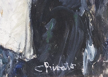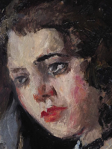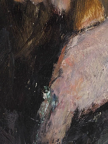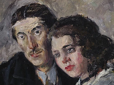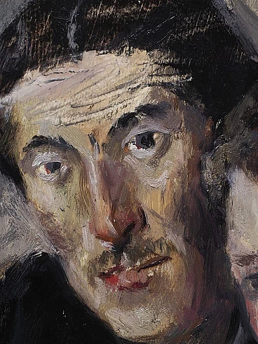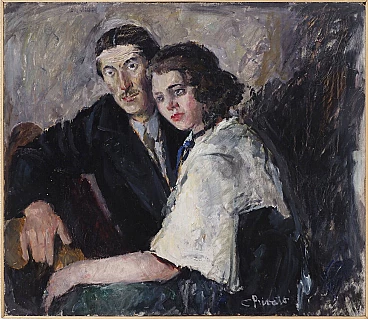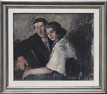 Oil painting on panel by Cosimo Privato (Venice, 1899 – 1971) depicting a family portrait, 20th century. Within frame. Signed lower right "C. Privato". The painting, in an excellent state of preservation, depicts a middle-aged couple sitting, with the female figure positioned to the side in front of the male one. Extremely realistic, like the entire series of portraits created by the well-known Venetian painter, the work also stands out for the careful use of the material and the choice of colors with the clear contrast between light and dark, with the white of the shirt and the color red of the woman's lips to stand out clearly. Born in Venice in 1899, Privato entered the Royal School of Art applied to Industries in 1919, based in the ancient Carmini convent, where he attended the pictorial decoration section and later obtained the qualification for professional artistic teaching. Like many young artists of the same generation (Juti Ravenna, Neno Mori, Eugenio Da Venezia, Luigi Scarpa Croce and others), he turned to the activity of the Opera Bevilacqua La Masa, which since 1908 has reserved for young artists the possibility of exhibiting in the halls of Ca' Pesaro. Here Privato made his debut in the annual collective exhibition of 1920 with three works (The Eremitage, Self-portrait, Portrait). Although it is a particular edition, without the protagonists of the first Capesarina season, in fact the protest of the "dissident" artists, who exhibited in parallel at the Geri Boralevi gallery in Piazza San Marco, was raging, it represents for the artist the beginning of continuous participation in the events of the Bevilacqua La Masa, which he attended until the thirty-first edition of 1940. From 1922 to 1923 he was granted, on the third floor of Ca' Pesaro, a studio to practice his artistic activity (assignment renewed for the three-year period 1925 -1927); in 1932 he was also a member, together with Carlo Dalla Zorza, Juti Ravenna, Bruno Saetti and Toni Lucarda, of the acceptance jury of the exhibition. It is undoubtedly from the mid-1920s that his work achieved considerable notoriety at a local and national level. From 1926 to 1938 his paintings appeared at the International Art Exhibition of the City of Venice, where he stood out among the youngest exhibitors; in the same years, he also participated in the exhibitions of Italian art organized abroad by the Biennale itself (an example of which, in 1933, was the exhibition of modern Italian art organized by the National Fascist Fine Arts Union and presented by Antonio Maraini at the Künstlerhaus in Vienna ). We can also remember, in the Italian context of the 1920s and 1930s, the important participations in the III Roman Biennale (1925) and the II Quadrennial of Rome (1935), at the International Fine Arts Exhibitions of Fiume (1925, 1927), at the exhibitions organized by the Society for Fine Arts of Milan (1924, 1925) and at the Trade Union Exhibitions of the Tre Venezie. The numerous purchases that took place on the occasion of the exhibitions (by King Vittorio Emanuele III, the City of Bari, the Cassa di Risparmio di Venezia, the Municipality of Venice, the Prefecture of Venice, the Ministry of National Education, the Banca d' Italy) confirm the appreciation received. Although late, if considered in relation to the times and the contemporary development of the avant-garde currents, the prolific season of the '20s and '30s constitutes a significant piece of the figurative tradition of the Venetian and Venetian areas: the artist's pictorial production shows in fact notable qualities both in the application of the colour, thanks to the agility of the brushstroke and the wise choice of shades, as well as in the conception and rendering of the subjects; if it is the portrait genre that is preferred, and more generally the composition with figure, Privato does not lack inventiveness and over the years has created an eclectic catalog of characters and situations, showing a strong decorative streak combined with lively qualities of narrator. In the 1940s and especially in the post-war period, Privato's exhibition activity was limited, in the face of a progressive withdrawal from the public scene and an ever-increasing distance from the Venetian environment; we note some personal exhibitions held in Venetian galleries (at the Venezia gallery in 1945, at the Sandri gallery in 1946, at the Ongania gallery in 1947) and his participation in the group of "della Valigia" painters, gathered around the Hotel Gorizia. Rather, Mario Coscia's Galleria Trieste assiduously hosted the artist's personal exhibitions from the 1940s to the end of the 1950s (1941, 1947, 1950, 1951, 1952, 1954, 1956), in which the prevailing genre scenes (The Masquerade, 1947) and a revisitation, sometimes rapid and summary, of the subjects that have dotted the entire span of his artistic career.