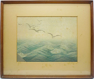Ancient woodcut depicting seagulls in flight. Measurements: cm. 20×26 – with frame cm. 32.5×40. Some small signs of inflorescences, however in good general condition. Oriental art.