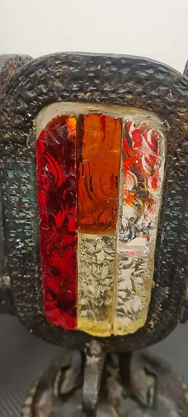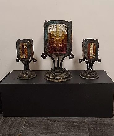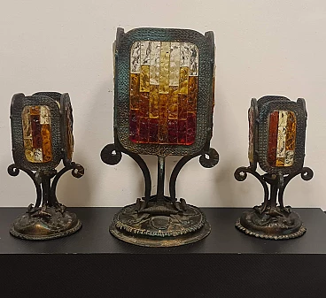 Set of three Brutalist style table lamps attributed to Poliarte. Three particular lamps, one large central one and two smaller side abat-jours. Made in the 1970s from hand-wrought iron with Murano glass mosaics in shades of orange. These particular and eclectic lamps will give your rooms an unconventional and refined style. They have no brand name, but in terms of age, execution and design they can be traced back to the Poli Arte company.