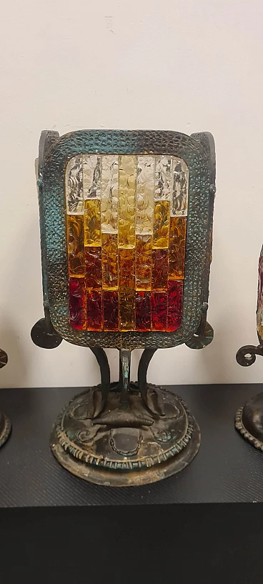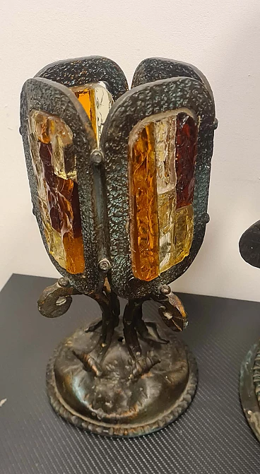 Poli Arte was founded in 1968 thanks to the genius of the master Albano Poli to whom we owe the birth of the Brutalist style lamps. On the strength of his experience in the production of stained glass, he decided to use a similar technique for the production of lighting accessories. The lamps are in a good state of preservation, showing their patina of time. They will be delivered with new electrics. Large lamp: height 48 cm, width 30 cm, depth 30 cm. Small lamps: height 33 cm, width 20 cm, depth 20 cm.