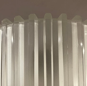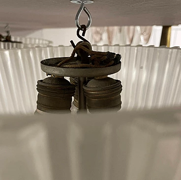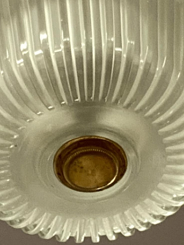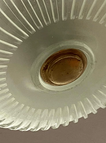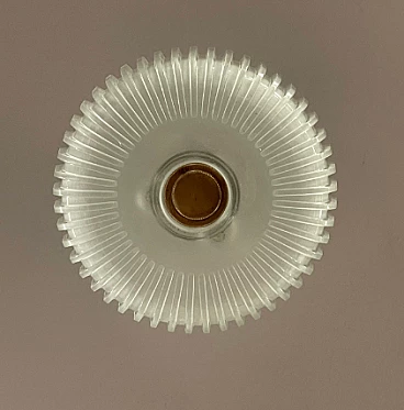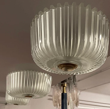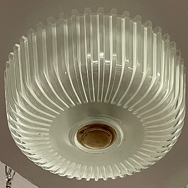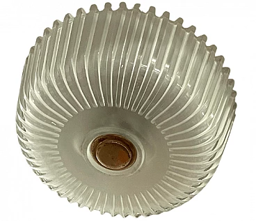 Recessed ceiling lamp by Seguso in hand-cut Murano glass, 1930s-40s. It features alternating bands of frosted and clear glass with a ripple pattern. A central round brass "cap" completes the lamp.