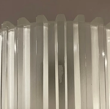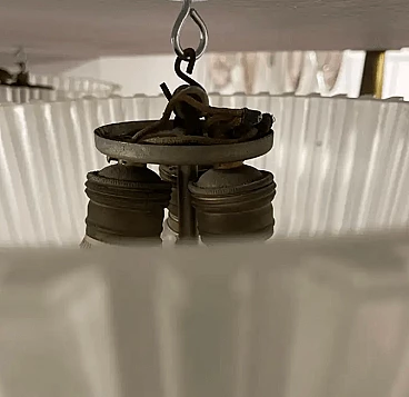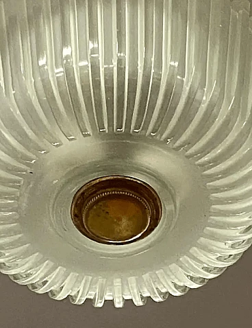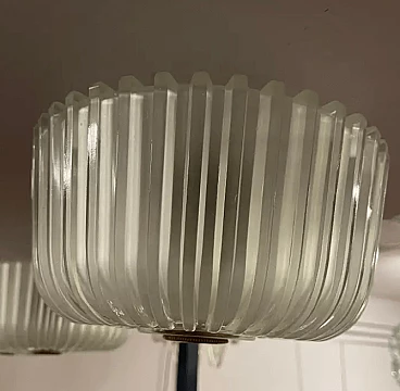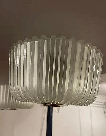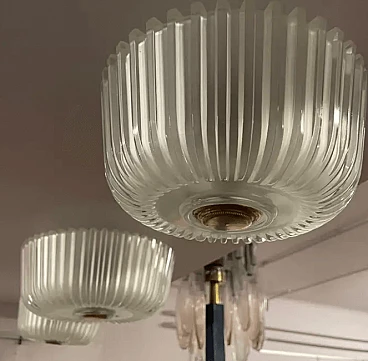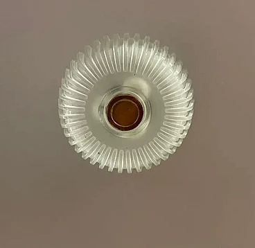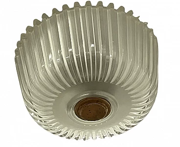 Hand-crafted Murano glass recessed ceiling light by Seguso designed and made between the 1930s and 1940s. The pieces feature alternating bands of frosted and clear glass with a ripple pattern. Brass center disc caps complete the pieces. Diameter: 26cm.