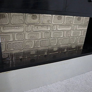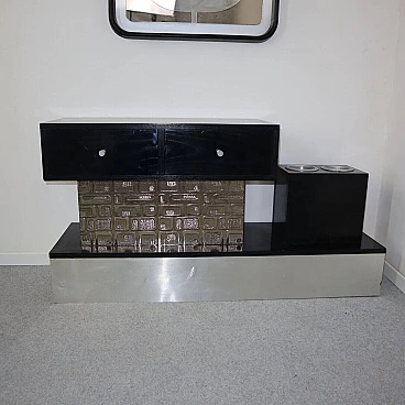 Immerse yourself in the charming atmosphere of the 1970s with this console table and its matching mirror. An authentic piece of vintage design, the console table features an aluminum frame and panels decorated with engraved geometric glass, capturing the distinctive aesthetic of modernism of the era. Its dimensions (63 x 120 x 35 cm) make it a versatile option to enrich any space. The console table retains the patina of time, with marks that tell its story without compromising its beauty and functionality. Next to it, the matching square mirror makes a timeless style statement. With two-tone edges and beveled corners, it adds a touch of elegance to your room. The mirror's dimensions (63 x 63 cm with a depth of 5 cm) make it an ideal complement to the console table. The wear consistent with age gives the piece a unique character, transforming it into a tangible testimony to lived history. Together the console table and mirror stand as a combination of history and design, bringing the essence of the 1970s with authenticity and retro charm.