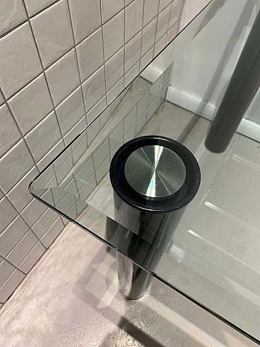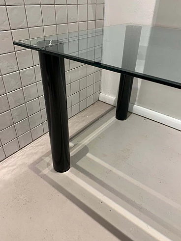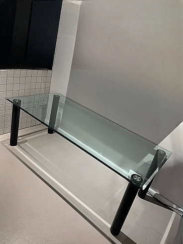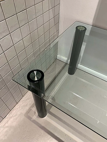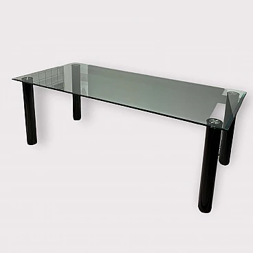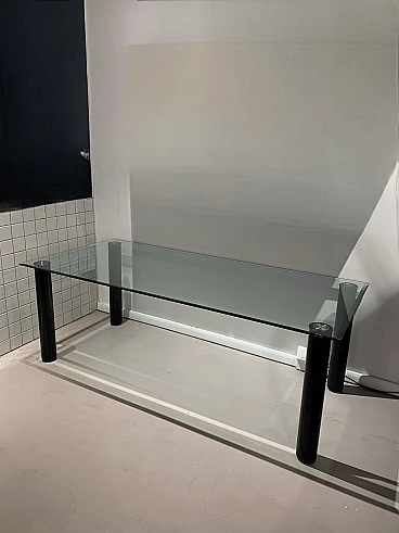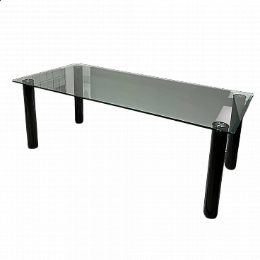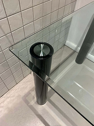 Marcuso table by Marco Zanuso for Zanotta, late 1960s-1970s. Transparent crystal top and 18/8 stainless steel legs. A cult piece by Zanotta, designed by Marco Zanuso, brilliantly inaugurating the 70s design season. The table is made up of a thin crystal top with characteristic rounded corners, supported by four important tubular stainless steel legs, removable and screwed to stainless steel bottoms welded directly onto the plate. Zanuso imagines translating the deflector technology of the automobile to finally go beyond Marcel Breuer and all the others who had designed glass tables with a traditional structure of legs and crosspieces. With Marcuso everything changes, because "Zanuso traces the formal configuration of the object back to the fundamental geometries of the circle, the square and the rectangle. Once the suitable technology for direct welding between crystal and steel has been identified, the design research is oriented towards the solution of the attachment system between the support leg and the support surface, creating a stainless steel base which on one side is fixed to the glass top, and onto which the steel leg is screwed on the other". A constructively innovative table, structurally removable, "conceived and built like a modern building". Elegant and modern, Marcuso owes its name to a fun play on words: it is the acronym of its creator.