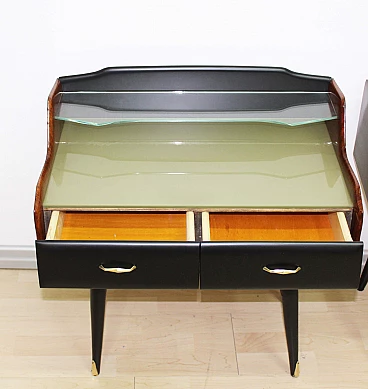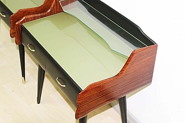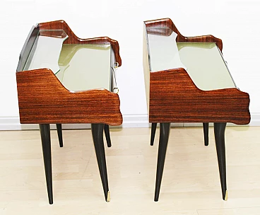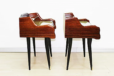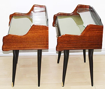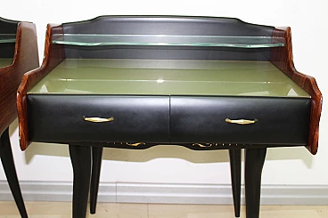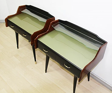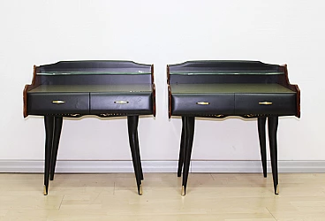 Pair of black lacquered rosewood bedside tables with glass top and shelf. Two drawers per bedside table with brass handles of the period, black lacquered wooden legs.