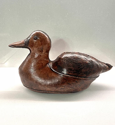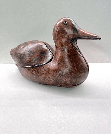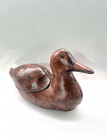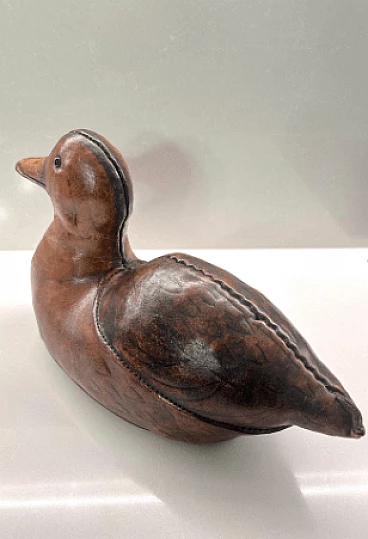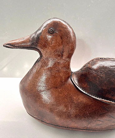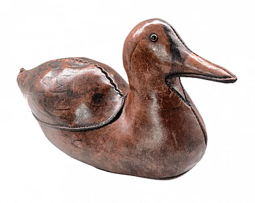Rare and delightful leather Duck sculpture by Dimitri Omersa for Omersa (England), 1970s. Excellent vintage condition, leather without breaks or tears. "Made in England" mark under the base.