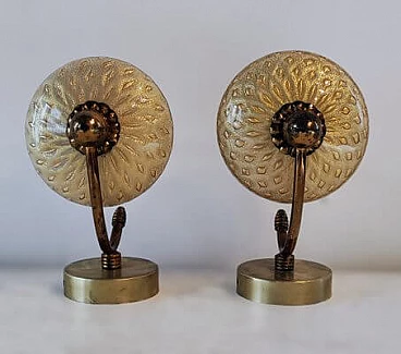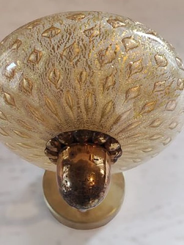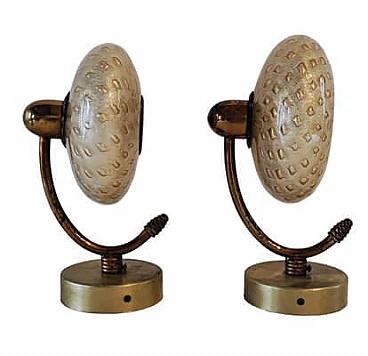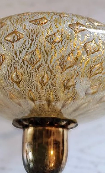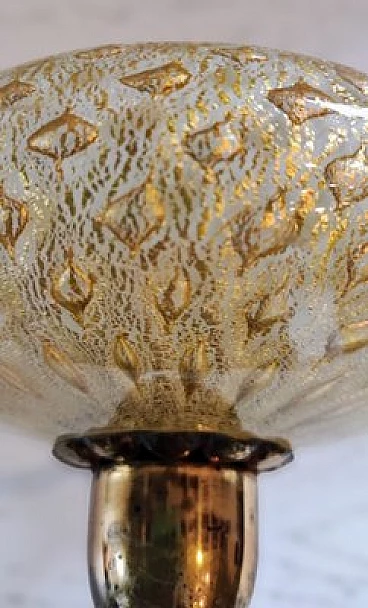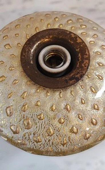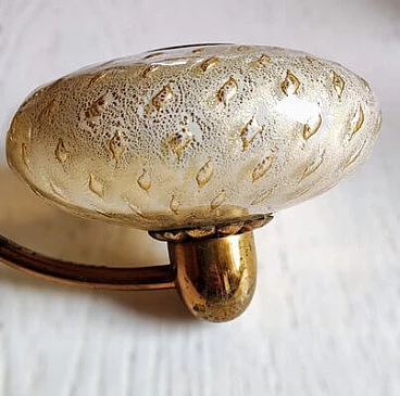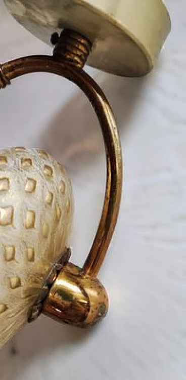 Wall sconce in bulglicant Murano glass dipped in a layer of gold-plated lattimo glass, 1950s. Original brass-plated metal stand. Electrical system restored. Diameter of glass diffuser: 11 cm. Seven lamps available, price per piece.