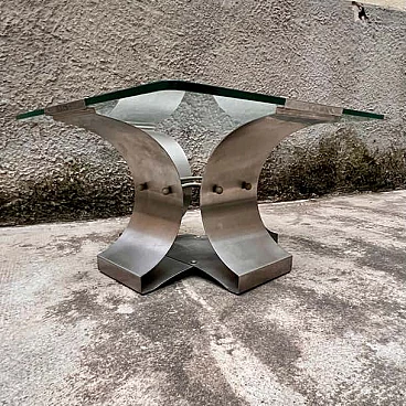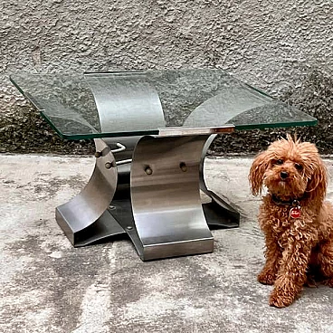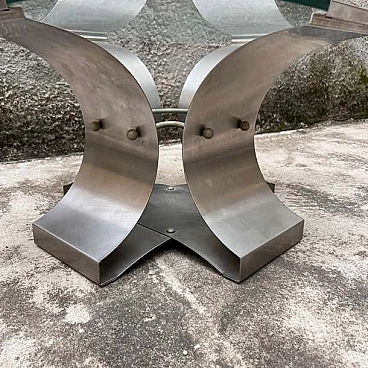 A Space Age style coffee table made of two bent and curved stainless steel plates, criss-crossed together to form a solid and indestructible structure, made to last. For the table top, a thick sheet of clear glass was placed between the claws of the ionic steel lozenges. Innovative for its time, it excellently represents the years of space conquests. Attributed to François Monnet, it was designed and manufactured in the 1970s in France by the Kappa company.
