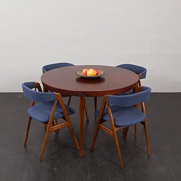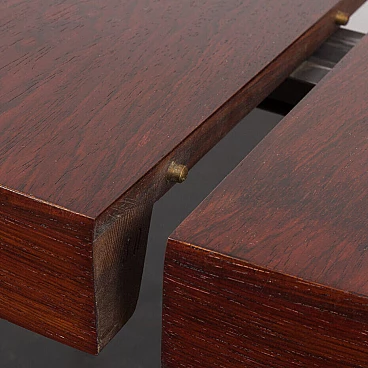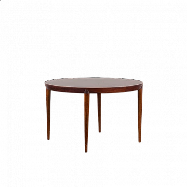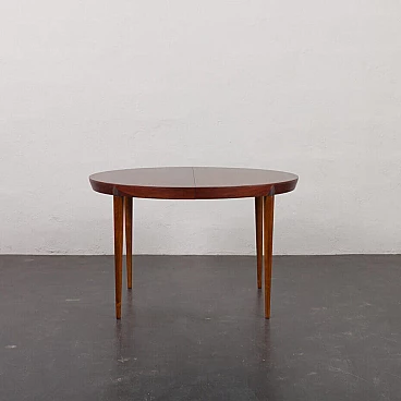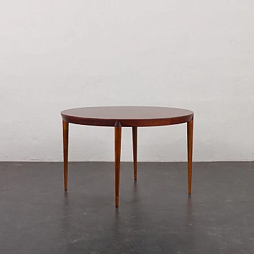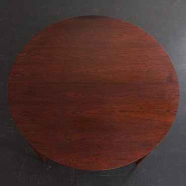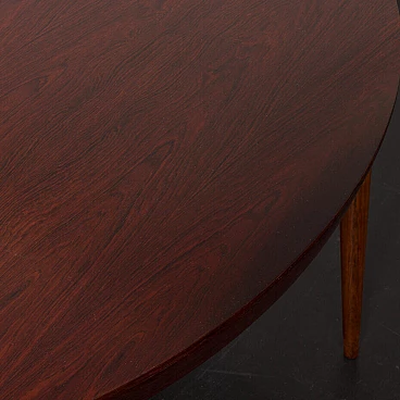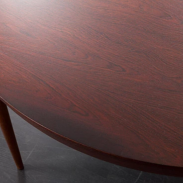 A classic and elegant rosewood dining table was designed by Severin Hansen for Haslev Mobler in the 1960s. This beautiful example of Danish craftsmanship, certified with the original sticker underneath, has a unique shape due to the elegant connection of the legs with the table top and the tapered edge of the table. The richly grained table top has a beveled edge that seamlessly joins each leg and all leaves have aprons, which create a beautiful continuous line when the table is fully extended. The table has two additional leaves to increase the space for ten guests, with a length of 216 cm. An additional fifth leg at the bottom opens almost automatically when the tops are separated. It is made of thin metal parts and therefore does not spoil the aesthetics. The table is in excellent original vintage condition. Our team has checked the table thoroughly. The sliding mechanism works without any problems. The lacquer has been cleaned and polished with professional compounds and is in perfect shape. There is a dark stain on the side of the table visible in the photos. We leave small signs of use that do not spoil the aesthetics and only confirm originality. We restore the cabinet to its best appearance, considering that it is 60 years old.