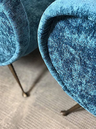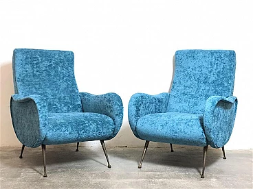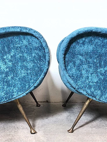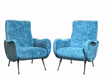 Pair of Lady armchairs attributed to Marco Zanuso, 1950s. Lady was awarded the Gold Medal at the IX Triennale di Milano in 1951. The armchairs are completely restored with new upholstery and inside. Light Blue mélange velvet fabric, brass feet with the typical 1950s design. Seat height: 40 cm. Seat: 50 x 40 cm.