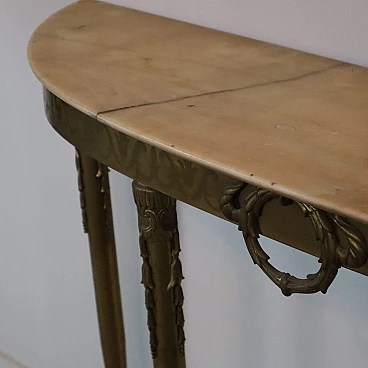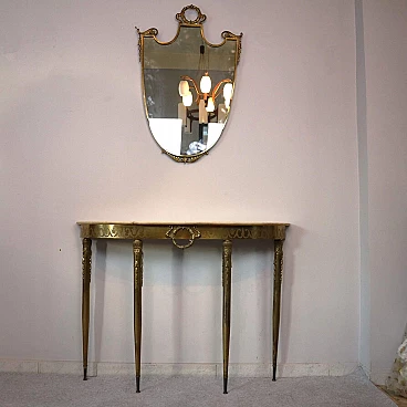 Transform your space with this rare and precious console table and mirror from the 1950s, completely made of brass and embellished with acanthus leaf details. With dimensions of 120 cm x 87 cm x 32 cm, this console table is not only functional but also a true piece of art that captures the spirit of vintage design. With dimensions of 92 cm x 62 cm, the mirror is perfect for hanging on a wall and adding depth and style to any room.
