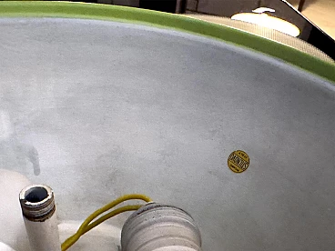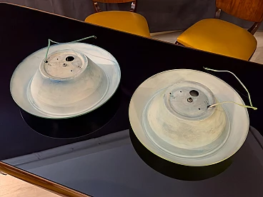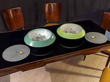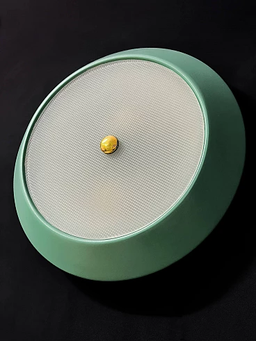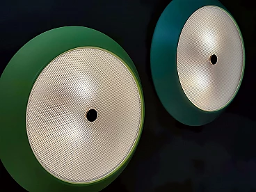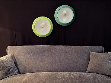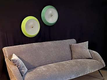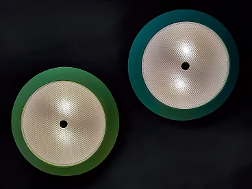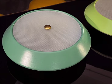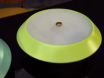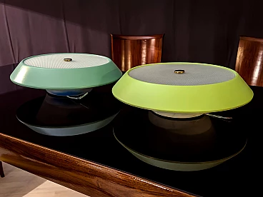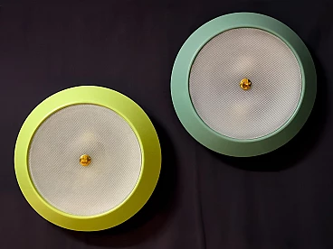 To your attention this pair of very pretty wall or ceiling lamps designed and produced by Stilnovo in the 1950s-60s. They are in excellent condition, both round aluminium diffusers have been repainted in their original and very delicate colours, canary yellow and sage green respectively. They have ribbed glass panes that give a very pleasant and warm diffused light when lit. On request, we can change both colours of the diffusers to whatever you wish. Both lamps are original Stilnovo lamps, one of the best Italian lamp manufacturers of the period together with Arredoluce, and are still marked on the inside with the first yellow Stilnovo sticker. The diameter of the single lamp is 40 cm, the electrical parts work perfectly and are original to the period, and we always recommend that you have them checked by a professional electrician to ensure that they are used in accordance with the country's conformity regulations before use.