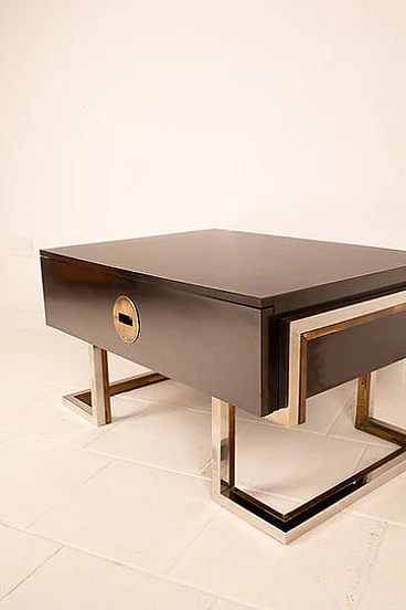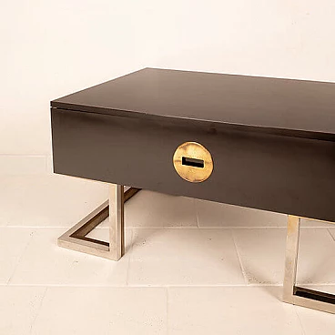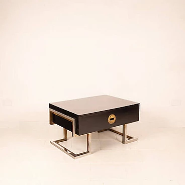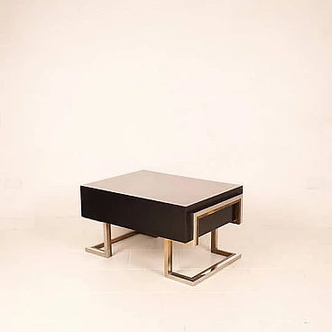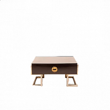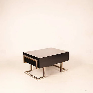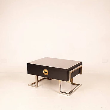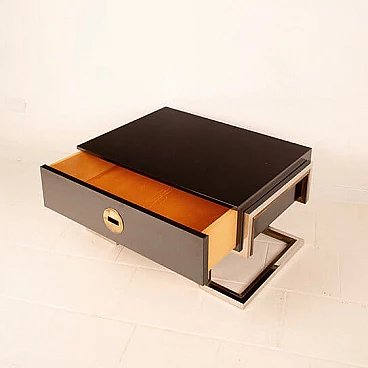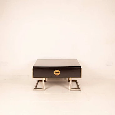 coffee table or bedside table designed and produced by Romeo Rega in the 70s. The coffee table is made of black laminated wood with brass and chromed steel legs in excellent condition. There is a large drawer with a brass handle where the author's signature is imprinted. It is generally in excellent condition, the brass of the legs has a wonderful patina of age which gives it a beautiful vintage character.
