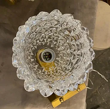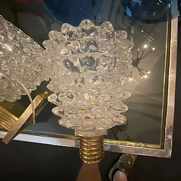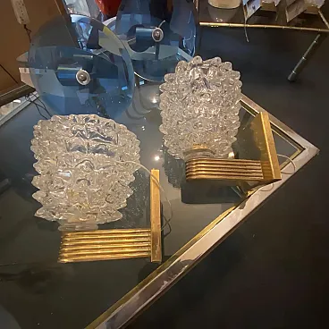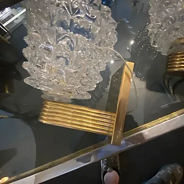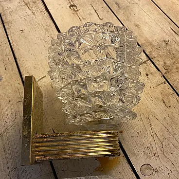 Pair of wall lamps designed and made in Italy in the style of Barovier, who invented this particular glass-working technique called Rostrato, characterised by large dots that reflect the light. These dots are obtained through a special technical trick, with brass that preserves the original patina and completely restored electrical parts. They operate on both 110 and 220 volts and require normal E27 bulbs. These wall lamps are extraordinary and unique lighting fixtures that embody the elegance and sophistication of their era. Combining the sleek lines and minimalist design of the Mid-Century Modern aesthetic with the artistic craftsmanship associated with the Barovier style, these wall sconces can serve as a prominent feature in a living room, hallway or dining area, adding functional illumination and a touch of timeless elegance to the space. The unique combination of artistic glasswork and iconic Mid-Century Modern design makes them a sought-after choice for those who appreciate the beauty of vintage Italian lighting.