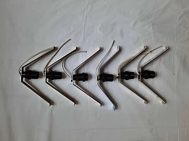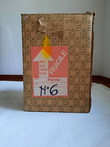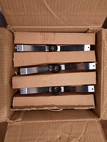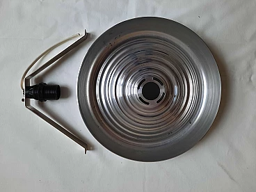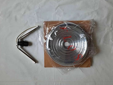 Padina/P2 recessed or wall lamp designed by Achille Castiglioni in collaboration with his brother Pier Giacomo and produced by Flos in 1966. Six lamps available (price per piece). Complete with original box. A formal and technical synthesis of a lighting concept, Padina is a concentrated and reflected light fixture. The casing, which contains the lamp holder, is obtained from a single sheet of aluminum with a wavy, mirror-polished surface on the inside, convex on the outside. The light emitted by the incandescent source, left exposed, is thus multiplied in a series of concentric circles. Created and reproduced in various versions, the P2 model of the lamp recesses into the wall, emanating direct and reflected light, and is complete with a galvanized metal stand, with a bakelite lamp holder and no visible wire.