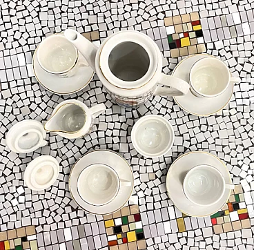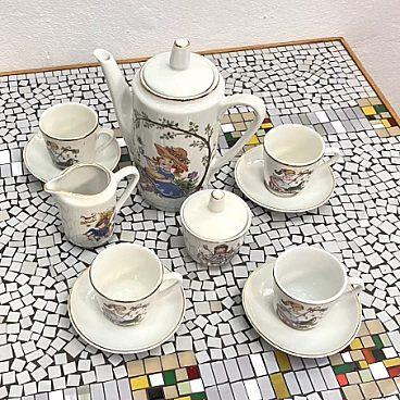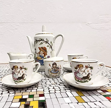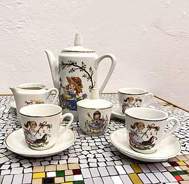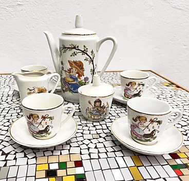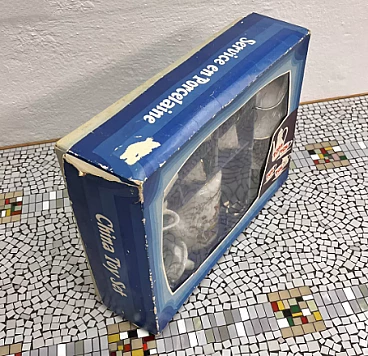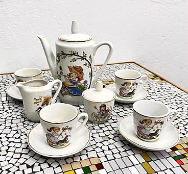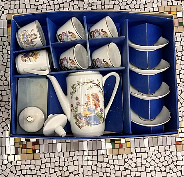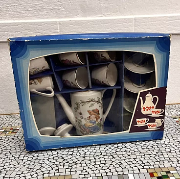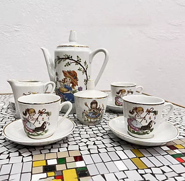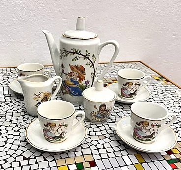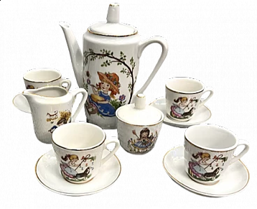 Porcelain children's toy tea/coffee service, 1970s. Made in the GDR (German Democratic Republic). Complete with original box. Consisting of four cups, four saucers, a milk jug, a sugar bowl and a tea/coffee pot. The cups are 5.2 cm high and 9 cm in diameter. The saucers are 2 cm high and have a diameter of 10 cm. The teapot is 15 cm high and has a diameter of 7 cm. The milk jug is 8.5 cm high and has a diameter of 9 cm. The sugar bowl is 6 cm high and has a diameter of 6.3 cm. Porcelain in good general condition, no visible cracks. Fantasy with childish motif and golden edge. A solidly made toy, then reserved for children from wealthy families. Despite being in good condition and sold in its original box, one mug has a scratch on the handle. This set was produced and imported in France; the approval was then issued by Sogerep, which guaranteed the product's compliance with French regulations. Weight: 1650 kg.