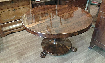 Round rosewood sail table on a circular base supported by iron feet. Restored and polished with shellac and spirit. England, William IV era, 1830-1837. Purchase proposals are under consideration.