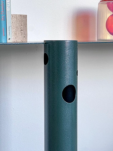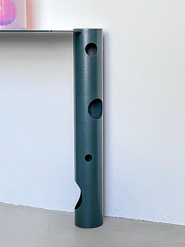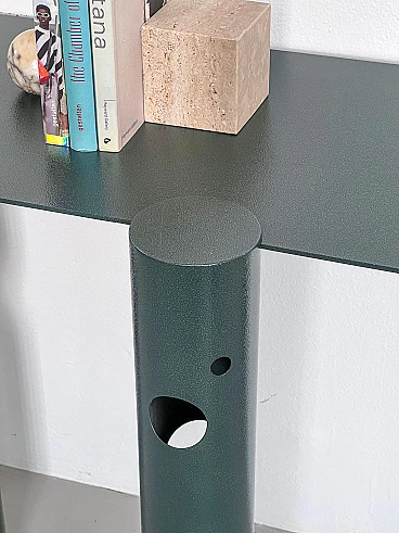 Silös console in green metal. Silös is a collection that brings together the attraction for abandoned spaces, metal, mechanics and industrial architecture of Milan. These elements, together with the hole, come to life in the Silös collection, which now aims to be a symbol of permeability to change and innovation. Through the holes, we can imagine glimpsing a new light, a bright future. The Silös pieces pay homage to the urban landscape of skyscrapers and industrial structures of Boccioni's "The City Rises". All pieces are made in Milan, to honor the city's artisanal ingenuity. The collection is entirely made of metal with a special finish that enhances its materiality. Silös is made up of a series of tables, a console and a modular bookcase; the console proposed here is among the first pieces to be put on sale.
