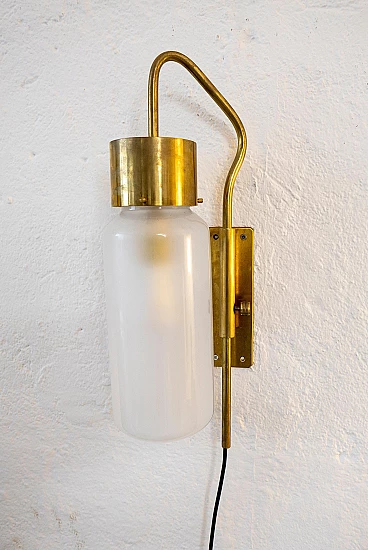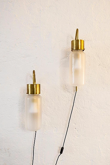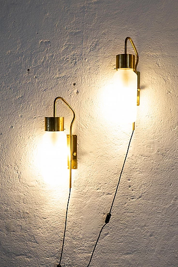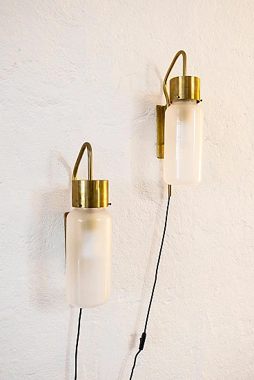Pair of LP10 Bidone wall lights by Luigi Caccia Dominioni for Azucena, 1950s. Caccia Dominioni is perhaps the most important architect of post-World War II Milan. His designs had a great impact on the reconstruction of the devastated city, while paving the way for the new style that would be called "Milanese rationalism" by historians and critics. But in addition to being a prolific architect, author of some of the city's most famous residential buildings, he also worked extensively as a designer, dealing with lighting and furniture. In 1947, together with colleagues Ignazio Gardella and Corrado Corradi Dell'Acqua, he founded Azucena. The brand, named after a flower, was active for many years in the field of high-end design. After a stop of several years, Azucena was revived and continues to produce the pieces for which it became famous in the past; however, it is the original pieces that drive collectors crazy at auctions and on the vintage market. The pair of LP10 lamps proposed here, nicknamed "Bidone" (because their shape resembles a milk can, "bidone del latte" in italian), is indeed part of the first production, as the details and patina suggest. The glass shades are probably original and match the originals exactly in shape, length and diameter. The lamps are fully functioning and have recently been serviced by a professional electrician to ensure their safety during use. They are delivered with the black wire visible in the picture, a switch and a plug. They can be easily converted for direct wall wiring.