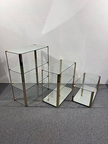 Stunning trio of Hollywood Regency design display cabinets. In the style of Gallotti & Radice. In excellent condition, no aesthetic or structural defects to report, only slight and obvious signs of time present, see photo. Large display case 112x80x42 cm, medium display case 76x80x42 cm, small display case 40x80x42 cm.