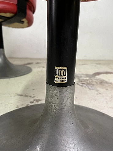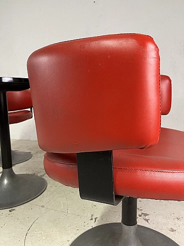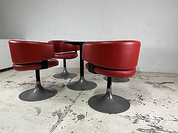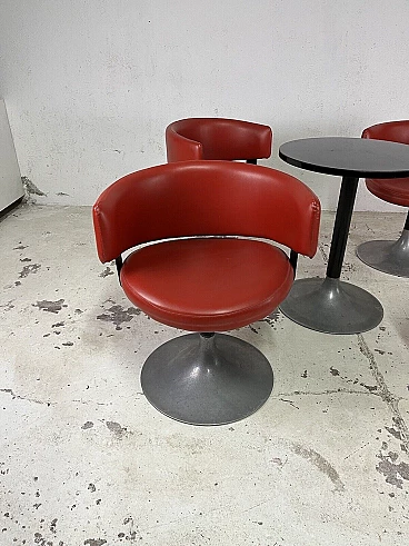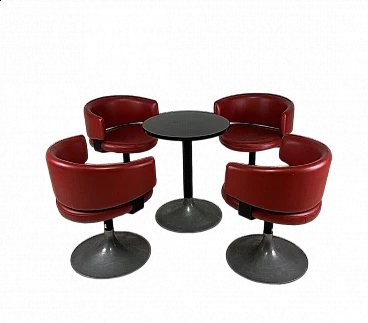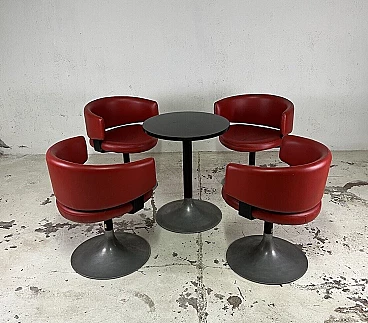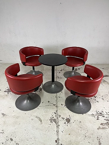 Space Age set consisting of four armchairs and a side table, 1960s. Aluminum base and leatherette upholstery. The set has been carefully cleaned, it is in excellent condition with a nice patina on the bases. The armchairs are 68.5 cm high, 58.5 cm wide and 52 cm deep; the seat is 41.5 cm high. The side table is 66 cm high and has a diameter of 55 cm.
