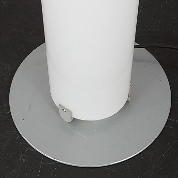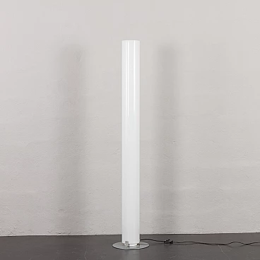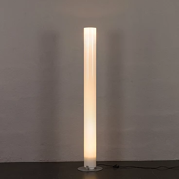 Stylos floor lamp by Achille Castiglioni for Flos, 1980s (designed in 1984). Stylos displays a striking simplicity that is anything but ordinary. A halogen bulb illuminates the column with diffused and reflected light at the base, while an incandescent bulb provides additional diffused light at the top. Each bulb is operated by a separate switch. The semi-transparent, cylindrical column, extruded in PMMA, provides pleasant and soft lighting, while the steel base, finished in silver, has been made heavy to avoid tipping. Stylos perfectly combines functionality and aesthetics, making it a versatile addition to modern interiors. The lamp has a switch on the cord with which it can be turned on and off. Cable length: 285 cm. Column diameter: 17 cm. Base diameter: 35 cm.