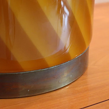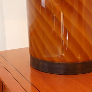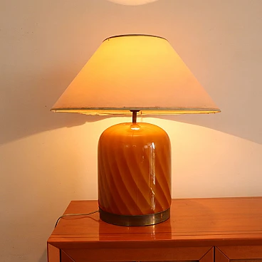 Add a touch of sophistication and vintage charm to your home with this table lamp produced by Tommaso Barbi in the 1960s in Italy. Featuring an elegant and sophisticated design, this lamp is a work of art that reflects the unique style of the era. Made with spiral-decorated layered glass and a brass base, this lamp exudes timeless elegance. The white fabric shade completes the refined look of the lamp, offering soft and welcoming lighting. The manufacturing mark adds a touch of authenticity and quality craftsmanship to this table lamp, confirming its provenance and intrinsic value as a piece of art. Add a functional and unique piece of art to your home with this Tommaso Barbi table lamp, an icon of Italian design that will transport the charm of the 60s directly into your living space. Height 60.