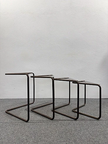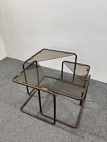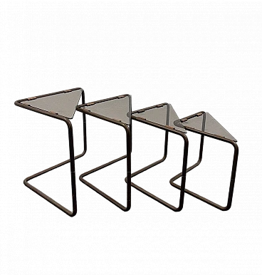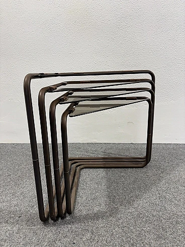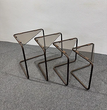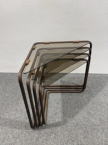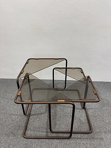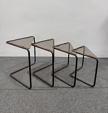 Set of four modular coffee tables, 1960s. Structure entirely in bronze-colored metal and smoked glass top. Good conservative condition, there are no aesthetic or structural defects to report, only slight and obvious signs of time due to use and age (see photos). The largest coffee table measures 49 x 49 x 49 cm. The second 45 x 45 x 45 cm. The medium one 42 x 42 x 42 cm. The smallest 38 x 38 x 38 cm.