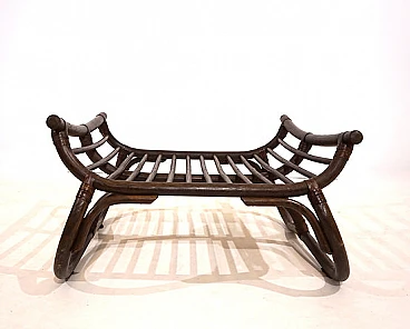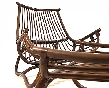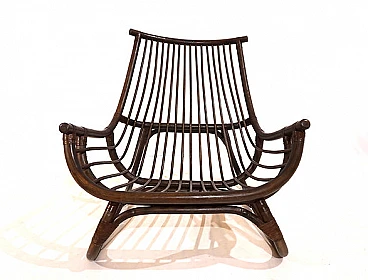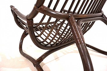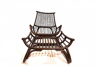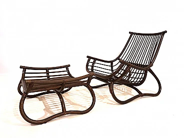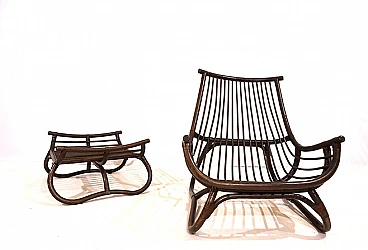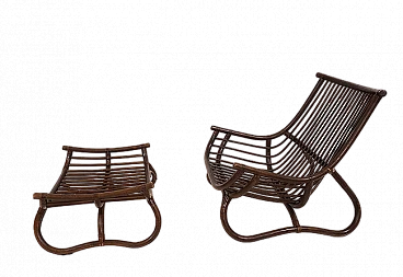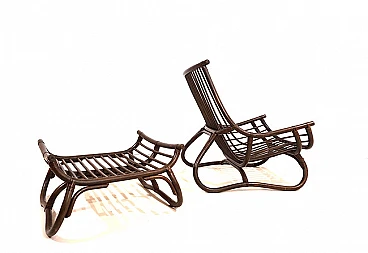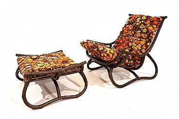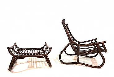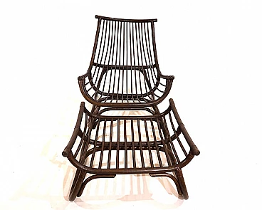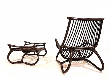 Manou rattan pagoda style armchair and footstool probably made in the late 1960s. The armchair is in very good condition: the dark stained Manou rattan structure shows minimal signs of wear; the backrest and seat grilles, as well as the reed joint elements, are flawless and undamaged. It has a cushion made of soft cotton fabric with a contemporary floral pattern; the cushion is perfect and makes the seat very comfortable. The matching footstool has the same style as the beautifully designed armchair. The design of the armchair is reminiscent of the style of the Japanese pagoda, especially in the back. Seat height: 31 cm. Seat depth: 57 cm.