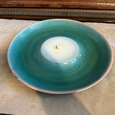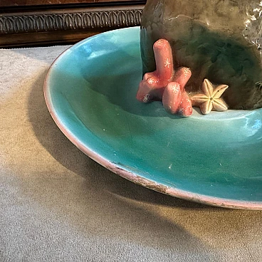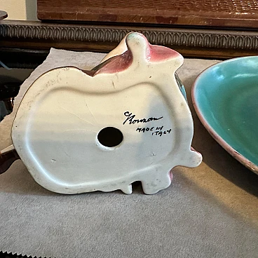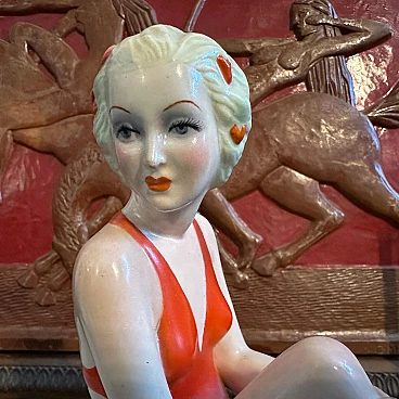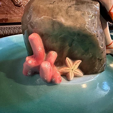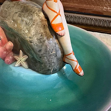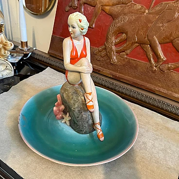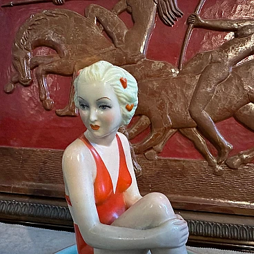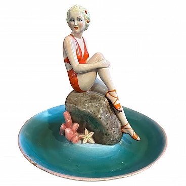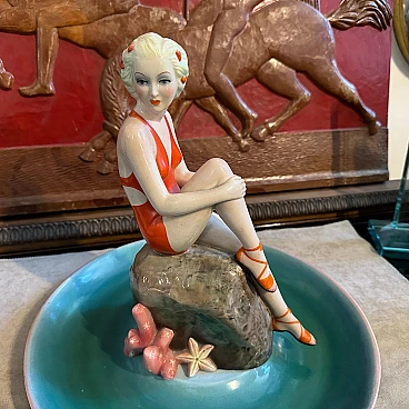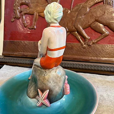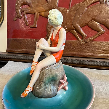 A hand-painted ceramic figure of a woman at sea made by the famous Ronzan factory in Turin; the object, of superb quality, consists of two pieces, a round base and the figure of a woman in costume sitting on a rock. The figure is signed Ronzan Italia on the base. Ronzan is a well-known Italian ceramic manufacturer that has been producing high-quality pieces since the beginning of the 20th century. They are particularly known for their figurines, vases and decorative objects, often characterised by elegant am designs and exquisite craftsmanship. The subject of an Italian woman at the seaside suggests a scene of leisure and relaxation, capturing the essence of the Mediterranean lifestyle. Hand-painted details add depth and character to the piece, showcasing the artist's skill. This ceramic figure is a charming addition to any collection of vintage or Art Deco-inspired decoration, evoking a sense of nostalgia for a bygone era of elegance and sophistication.