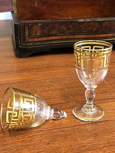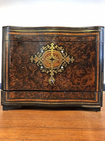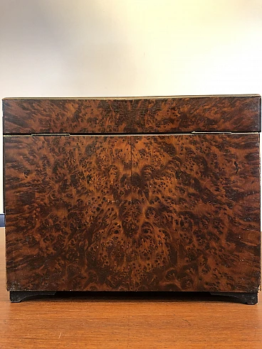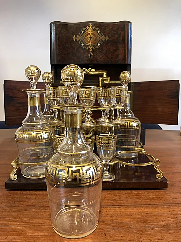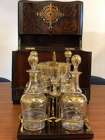 Napoleon III Thuja-root liquor box (cave à liqueur) made in France in the 19th century. Bois de rose thread inlay, mother-of-pearl and brass inlays. Rosewood inside with gilt bronze bottle and glass holder basket. The box consists of four glass bottles finished in gold (one of which is partially damaged, see detail photos) and fourteen small glasses (out of sixteen), one of which lacks the base (see detail photos). It is sold restored in the wooden part for 2200 euros or in its current state for 1600 euros (for more information contact the seller).