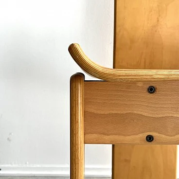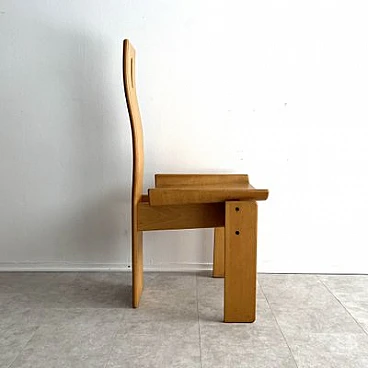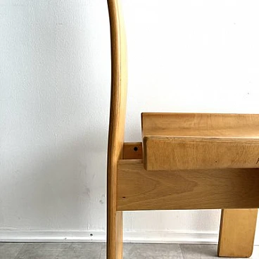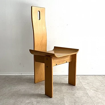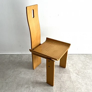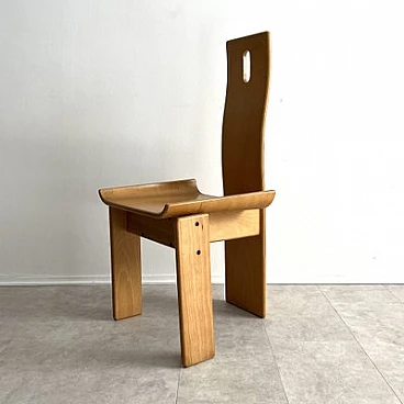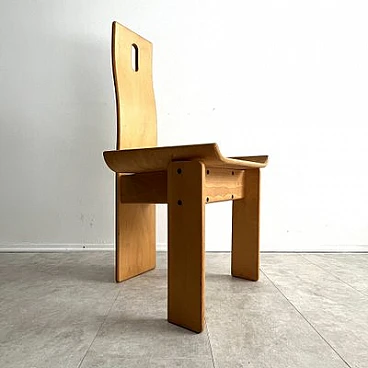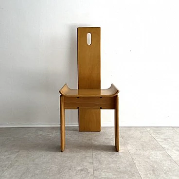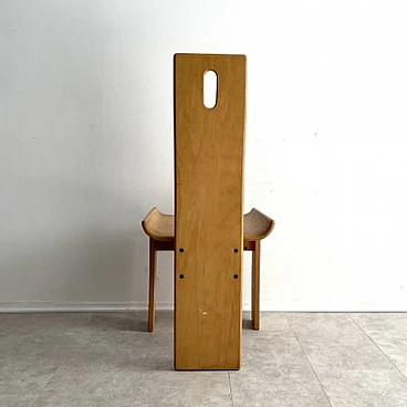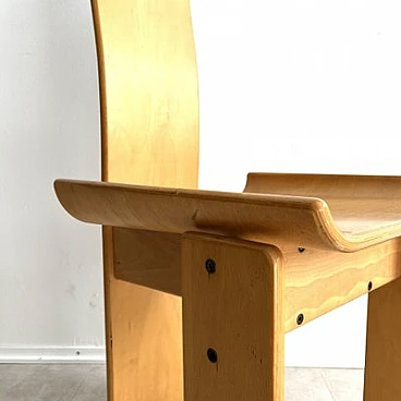 Brutalist sculptural dining chair by Edoardo Landi. The Diago chairs were designed by Edoardo Landi in 1973 for Nikol International, Italy. With a wide seat and curved backrest, this chair is extremely comfortable to sit on. With a minimally sculpted arched backrest support, a fluted oval handle and turned seats, this chair represents the design of early postmodernism. Brutalism entered the postmodern era using raw materials, simple silhouettes and geometric shapes. This stemmed from the post-Mid Century era that celebrated grandeur, glamour, geometric shapes and repetitive patterns. This chair was produced in limited quantities for specific showrooms internationally. The chair is made of laminated plywood. The chair is in as good condition as it was found and shows signs of age and use: such as fading, discolouration, rust on the screws, scratches and nicks on the wood. The chair is 47 years old and will continue to be a desirable collector's item, as not many were produced and they are hard to find. Moreover, Edoardo Landi's achievements in furniture design and art give it a significant history and provenance. His artistic work is based on the use of geometric shapes with programmed inclinations or separations through which he achieves changes in the viewer's perception. The artist has developed the phenomenon of retinal fatigue and optical illusions in some of his works, causing a close relationship between the viewer and the work.