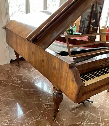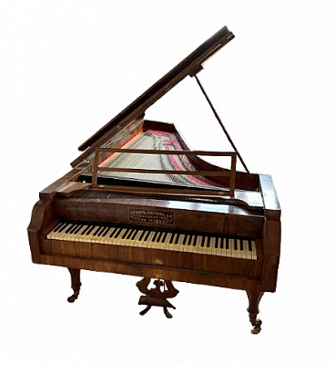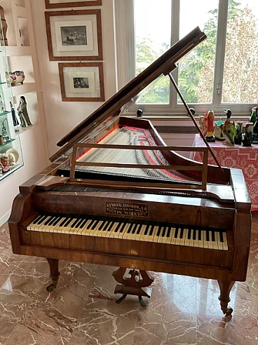 Grand piano by Simon Homolak (1808-1837), first quarter of the 19th century. Simon Homolak (also sometimes labeled Homolack) was born in 1808, presumably in Vienna, Austria. He was listed as a piano maker in Vienna. There is very little historical information available about him but it is very likely that this was one of numerous small family businesses that were once popular throughout Vienna and Austria as a whole. Known as the musical capital of the world, Vienna had a number of small, family-run businesses that built modest numbers of high-quality instruments, often built with exceptional pride and craftsmanship; only the best were good enough to be labeled with the family name. Unfortunately, over the years, very little history of these small Viennese companies has survived and Simon Homolak, who died in 1837, having lived only 29 short years, is sadly no exception. However, there remain some precious testimonies of some excellent pianos, especially concert grand pianos, among which the model proposed here stands out for its quality. Leg height: 54 cm. Good general condition, it requires tuning and minor restoration work.