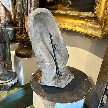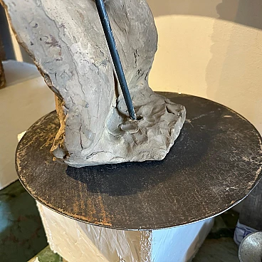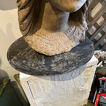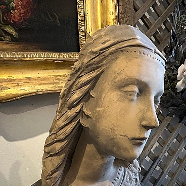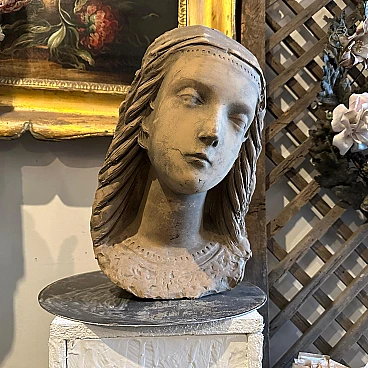 This terracotta young woman's head on a new iron base is a striking piece of sculptural art that blends the organic forms and stylised motifs characteristic of the Art Nouveau movement with the distinctive regional influences of Sicilian culture. This sculpture conveys a sense of harmony and elegance; the Sicilian influence adds a unique flavour to the piece. Sicily has a rich artistic heritage, influenced by various cultures throughout history, including Greek, Roman, Arab and Norman. This terracotta incorporates elements inspired by Sicilian folklore, mythology or traditional craftsmanship, adding depth and cultural resonance to the artwork. Terracotta, a type of fired clay, allows for refined details and subtle textures. It is a captivating blend of artistic styles and cultural influences, capturing the beauty and spirit of the Art Nouveau movement and the vibrant legacy of Sicilian art and culture.