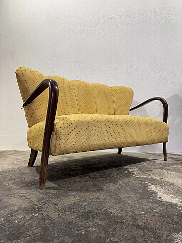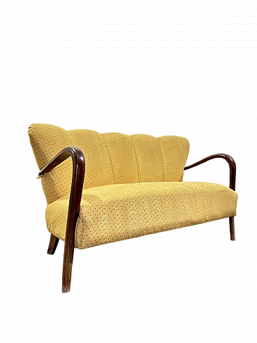 Shell sofa by Malatesta & Masson, 1950s. Bent wooden structure and fabric upholstery. Excellent conservation conditions, there are no major aesthetic or structural defects to report, only slight and obvious signs of time (see photos). Seat height: 43 cm.