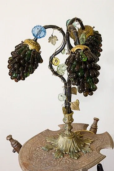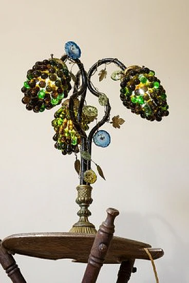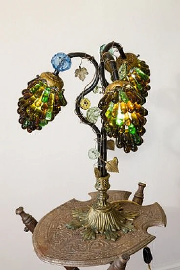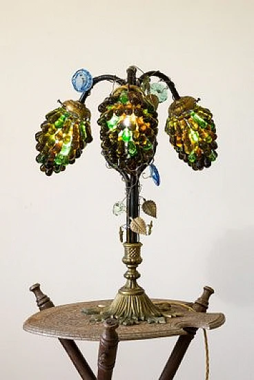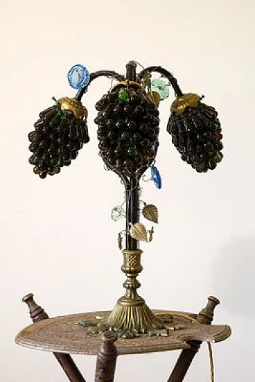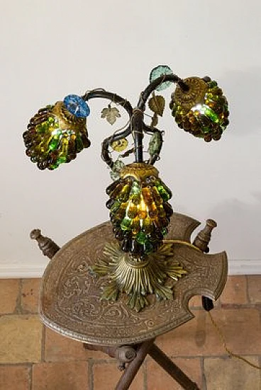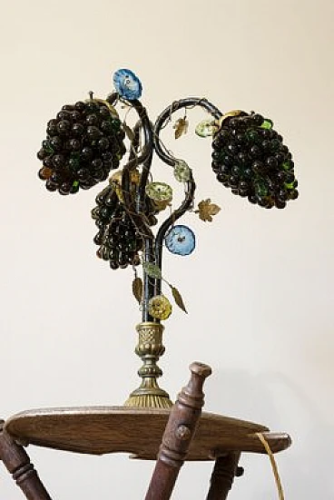 Art Nouveau lamp dating from the early 20th century. Its structure consists of a finely hand-crafted bronze base combined with an enamelled iron stem that serves as a solid base for a climbing plant. This plant, with its intricate branches, shoots, leaves and flowers made of coloured glass, envelops the lamp in an elegant embrace, similar to a real vine, thus creating an extraordinary fusion of natural beauty and elegant design. The chandelier consists of three arms, each of which is adorned with Murano glass shades that gracefully reproduce bunches of grapes. When the inner bulb is turned on, these lampshades diffuse an enveloping atmosphere, creating colour nuances of green, yellow and amber.