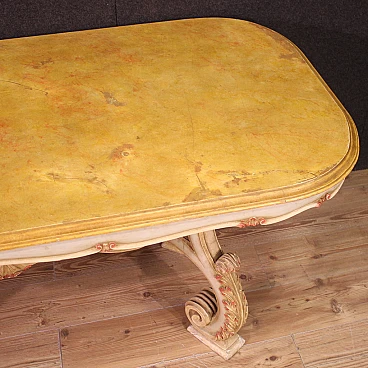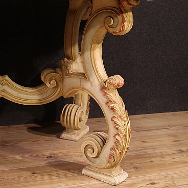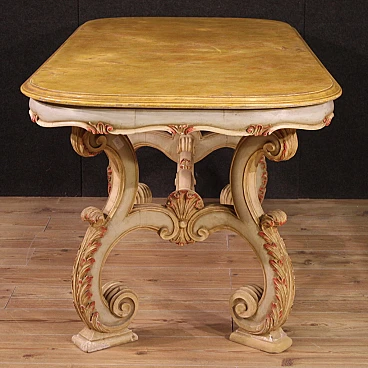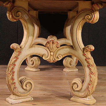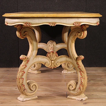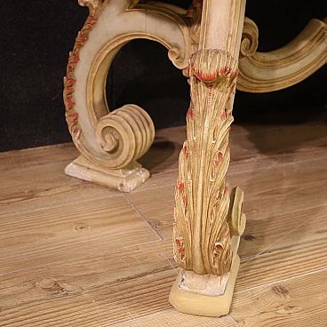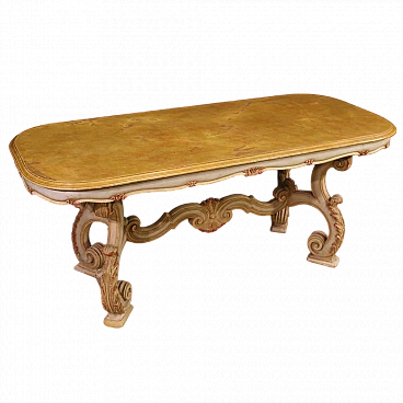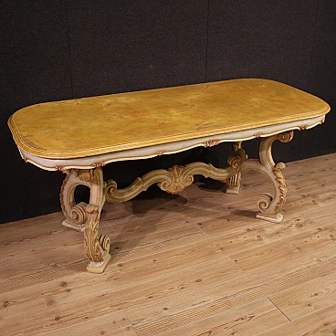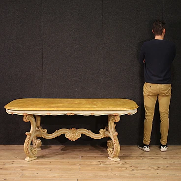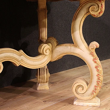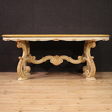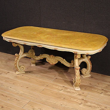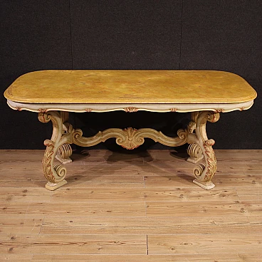 Venetian-style dining table, 1960s. Highly decorative piece of furniture made of richly carved and painted wood. Lacquered faux marble top with some scratches and signs of wear (see photos). Table of nice size and good service, ideal for a large dining room or living room. Stable and of very good solidity, it has some color lacks (see photos). Structurally solid, overall in good state of preservation.