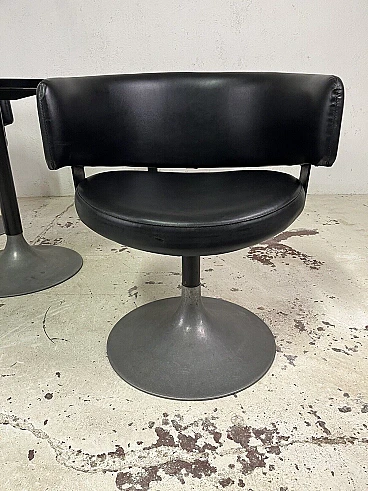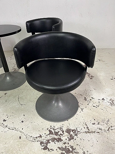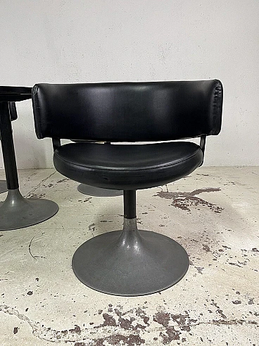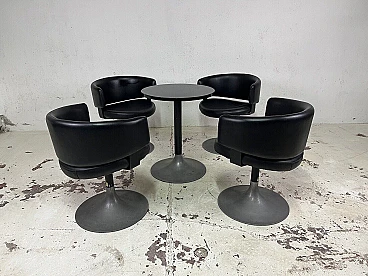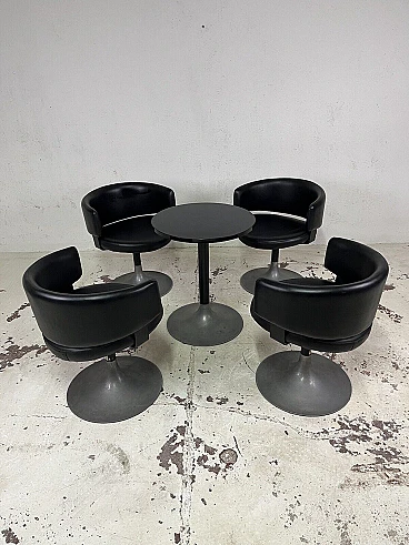 Set of four armchairs and side table in black vinyl and metal, 1960s. It has been carefully cleaned and is in excellent condition. The armchairs are 68 cm high, 60 cm wide and 50 cm deep; the seat is 45 cm high. The side table is 66.5 cm high and has a diameter of 55 cm.