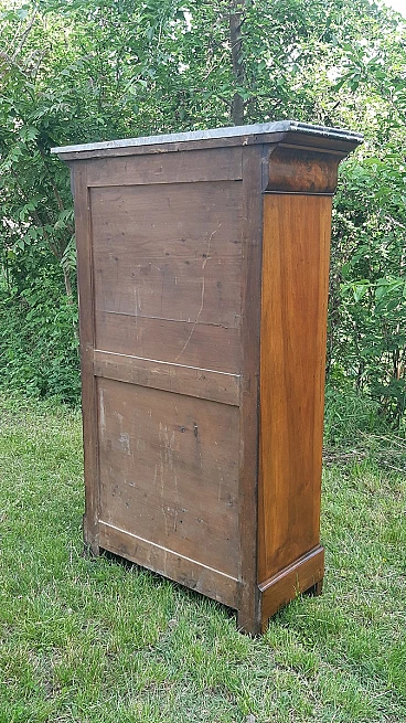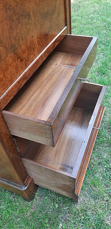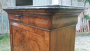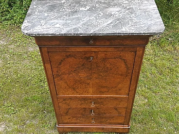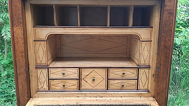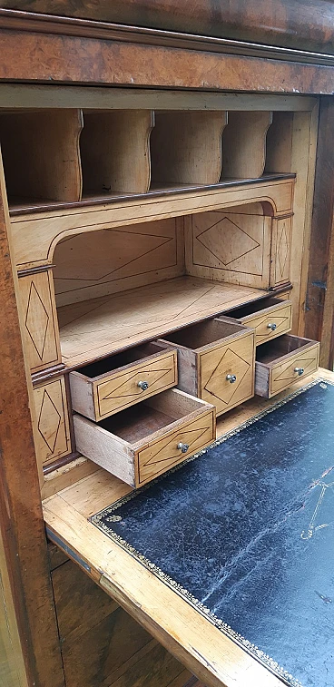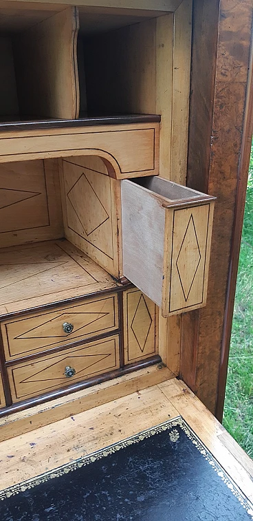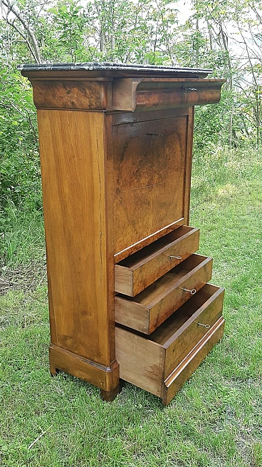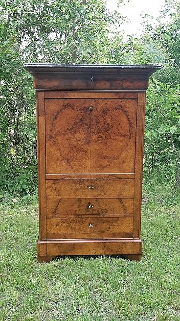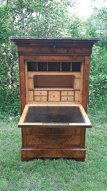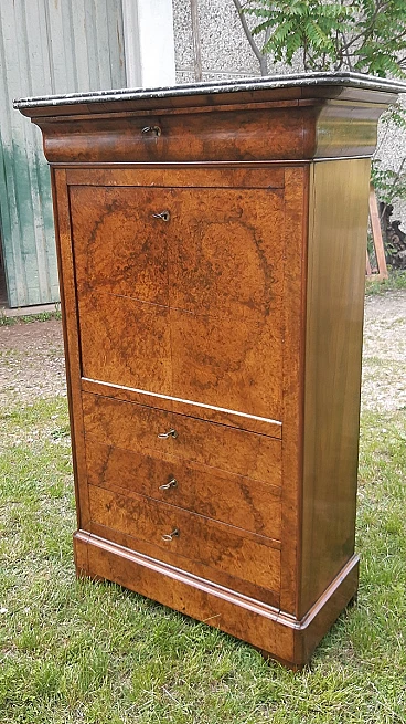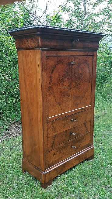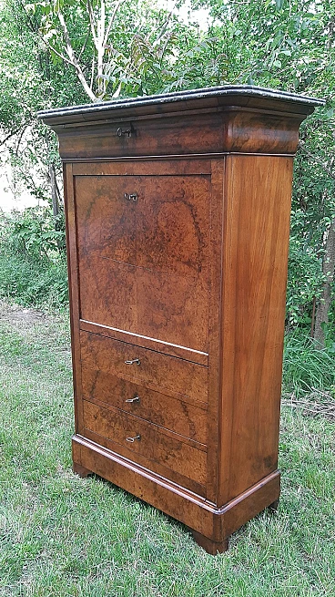 Louis Philippe walnut secrétaire with secret compartments, 19th century. Refined study desk with groove, completely veneered in walnut on the sides and selected briar-root on the front. Complete with coeval locks and keys, this piece of furniture houses a writing space veneered in maple with ebony thread inlays, a contrast that makes it stand out qualitatively from the whole. Another valuable element are the linings and the inside of the drawers in solid walnut. Drawers and secret compartments further enrich it.